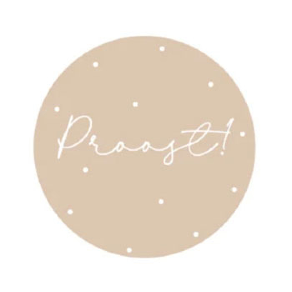 Onderzetters met de tekst 'Proost'. Ze hebben een doorsnede van 9 cm en zijn 3 mm dik. Gemaakt van Forex en daarom gemakkelijk schoon te krijgen.