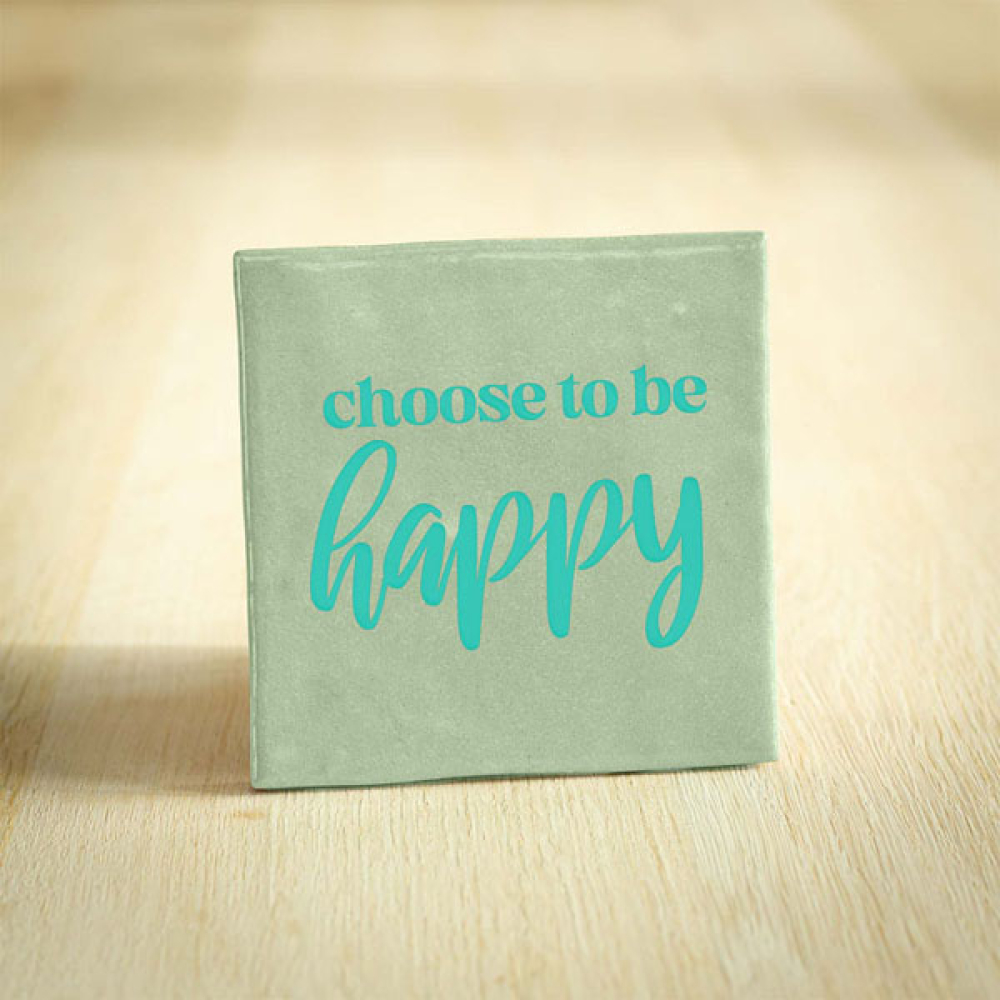 Tekst/Afbeelding: Choose to be happy Afmeting: 10x10cm Materiaal: Keramiek / vinyl Kleur tegel: Lichtgroen Kleur ontwerp: Zeegroen