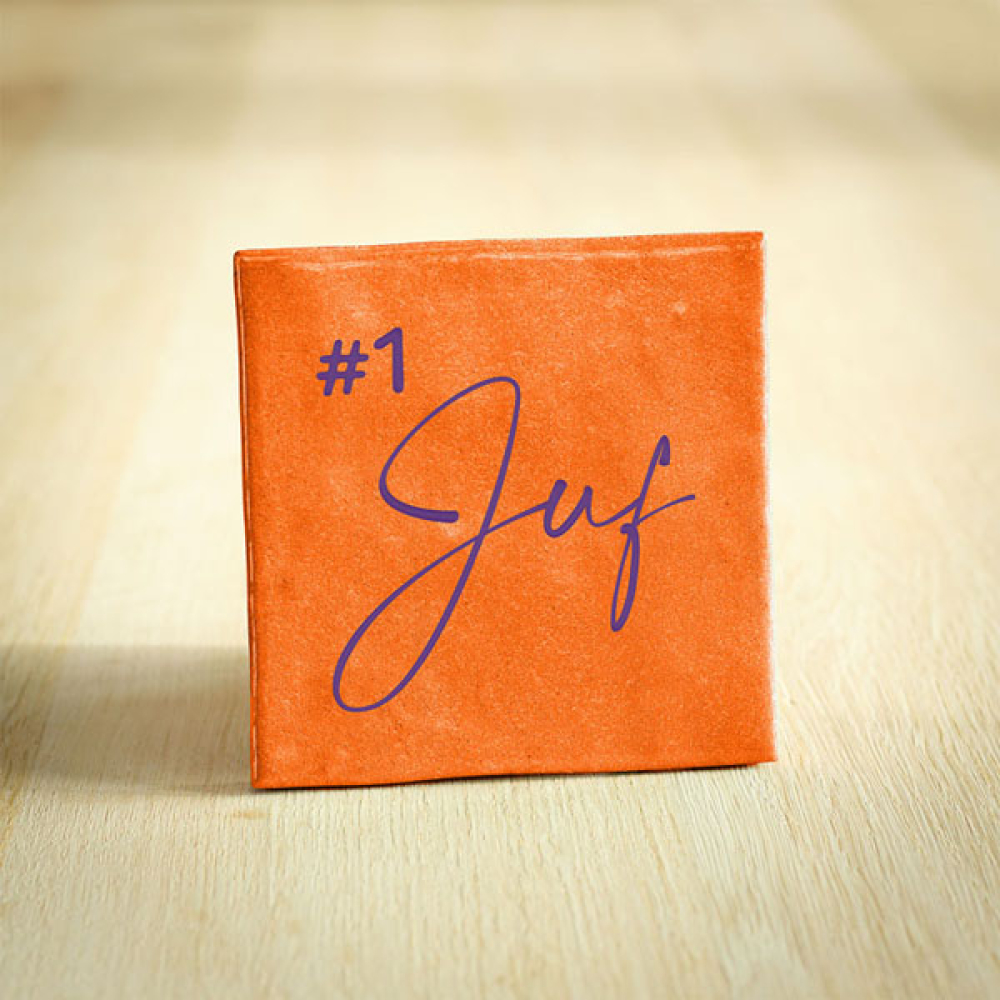 Tekst/Afbeelding: Juf Afmeting: 10x10cm Materiaal: Keramiek / vinyl Kleur tegel: Oranje Kleur ontwerp: Paars