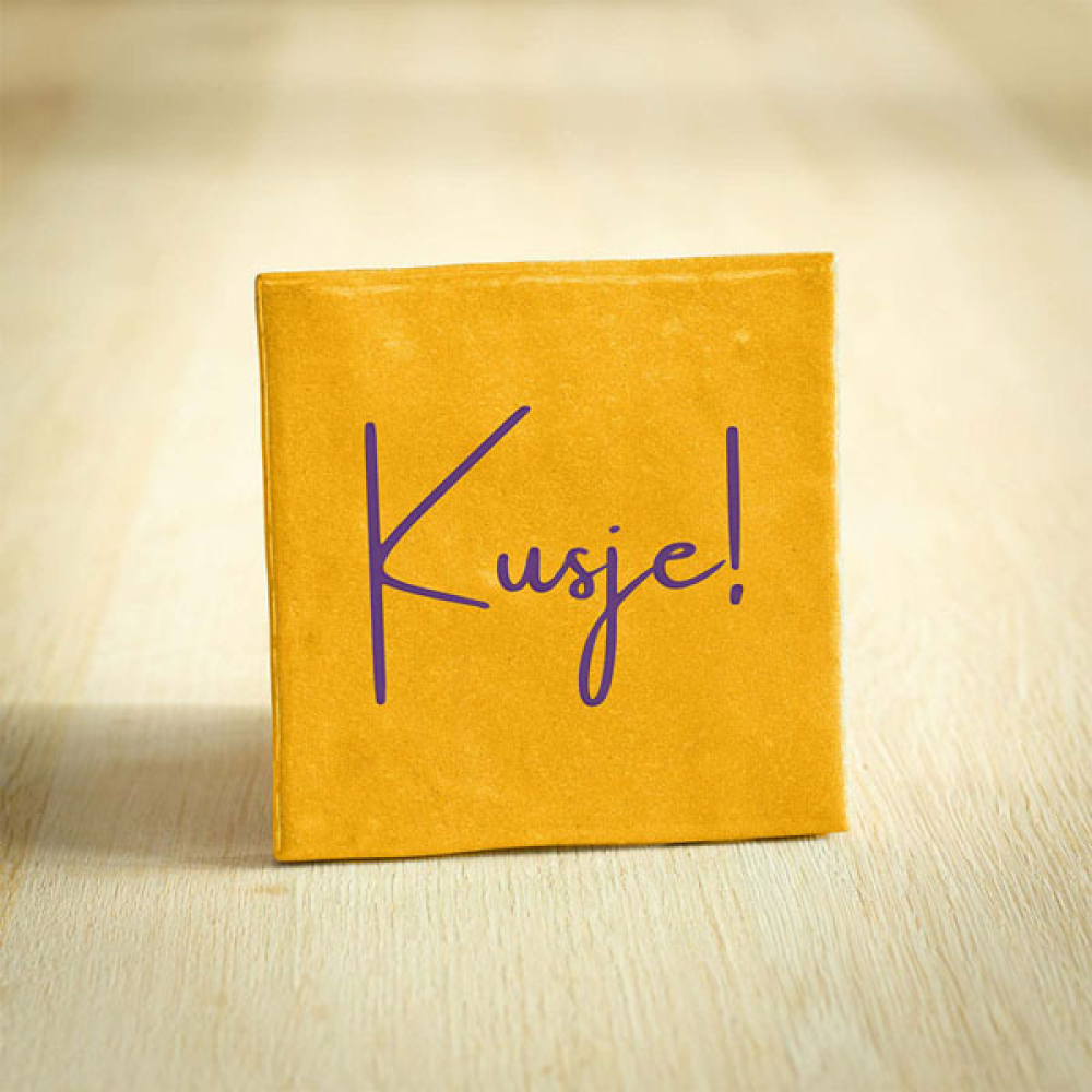 Tekst/Afbeelding: Kusje Afmeting: 10x10cm Materiaal: Keramiek / vinyl Kleur tegel: Geel Kleur ontwerp: Donkerpaars