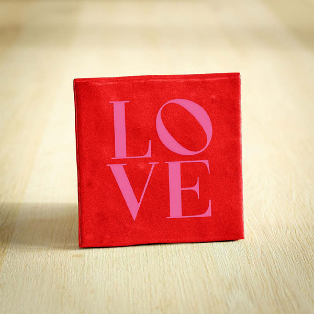 Tekst/Afbeelding: Love Afmeting: 10x10cm Materiaal: Keramiek / vinyl Kleur tegel: Rood Kleur ontwerp: Lichtroze