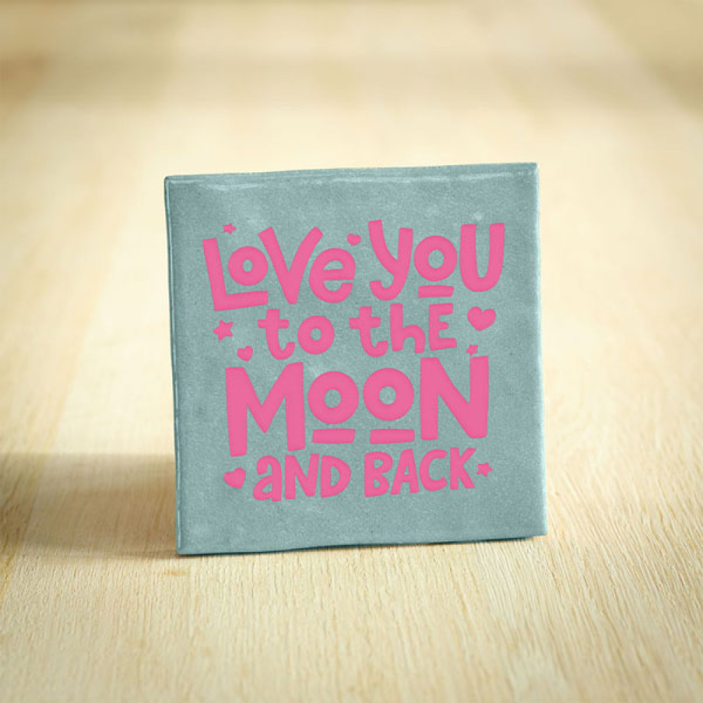 Tekst/Afbeelding: Love you to the moon Afmeting: 10x10cm Materiaal: Keramiek / vinyl Kleur tegel: Lichtblauw Kleur ontwerp: Roze
