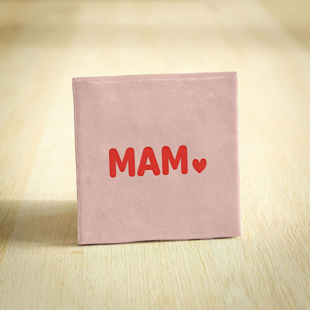 Tekst/Afbeelding: Mam Afmeting: 10x10cm Materiaal: Keramiek / vinyl Kleur tegel: Roze Kleur ontwerp: Rood
