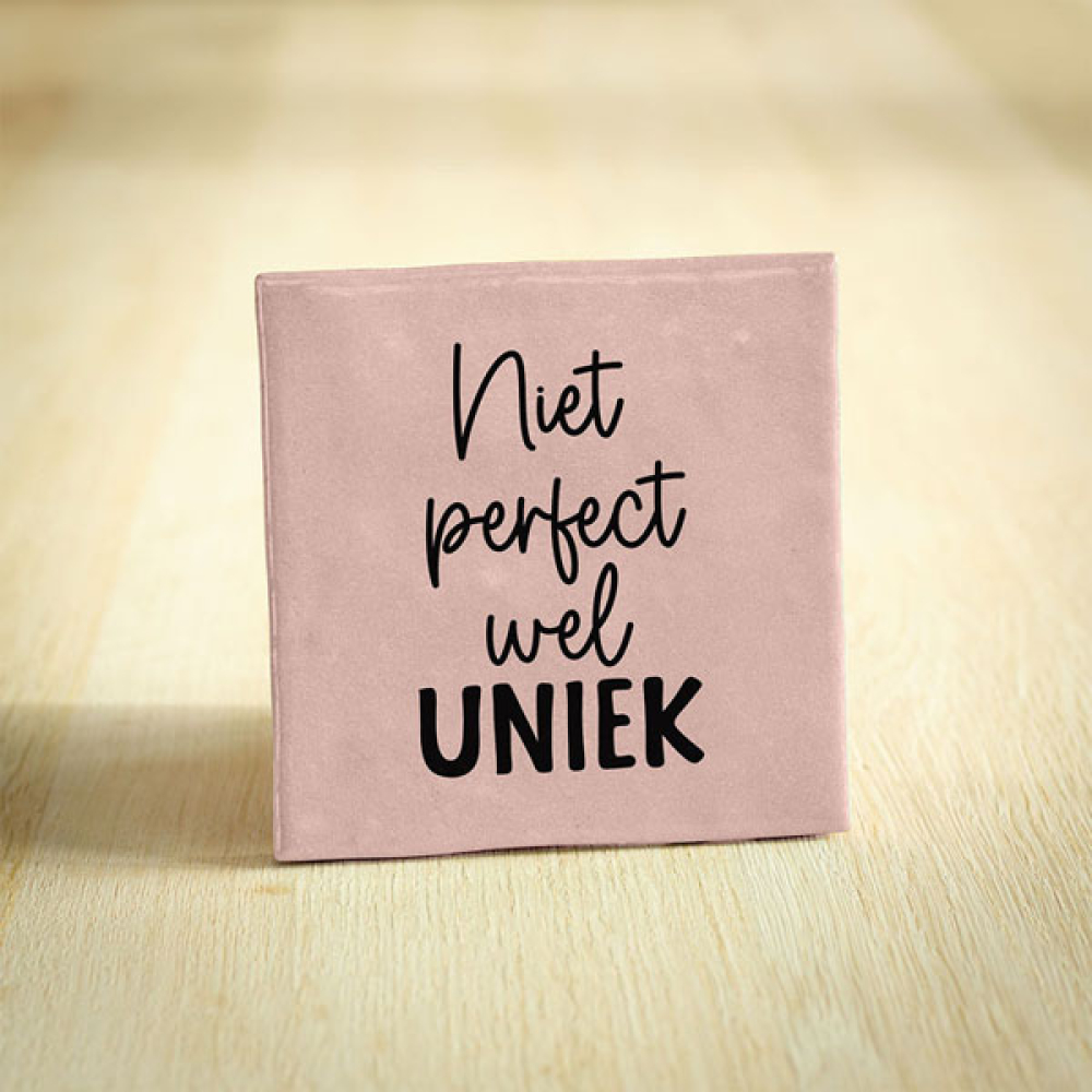 Tekst/Afbeelding: Niet perfect wel uniek Afmeting: 10x10cm Materiaal: Keramiek / vinyl Kleur tegel: Roze Kleur ontwerp: Zwart