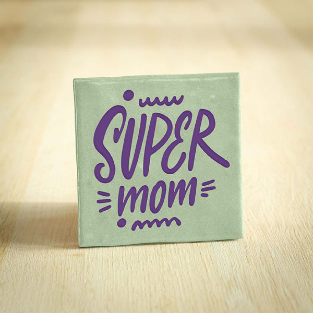 Tekst/Afbeelding: Super mom Afmeting: 10x10cm Materiaal: Keramiek / vinyl Kleur tegel: Lichtgroen Kleur ontwerp: Paars