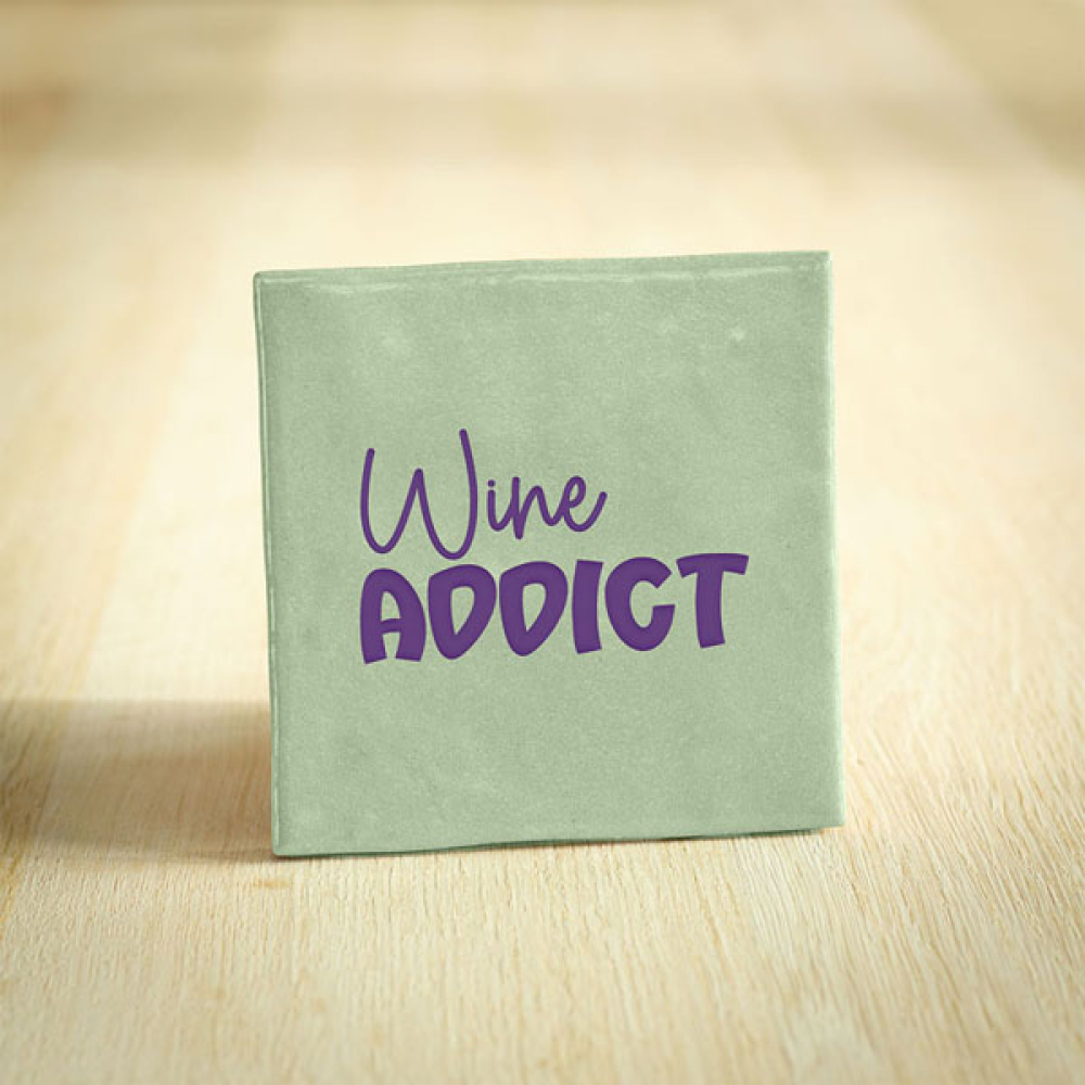 Tekst/Afbeelding: Wine addict Afmeting: 10x10cm Materiaal: Keramiek / vinyl Kleur tegel: Lichtgroen Kleur ontwerp: Paars