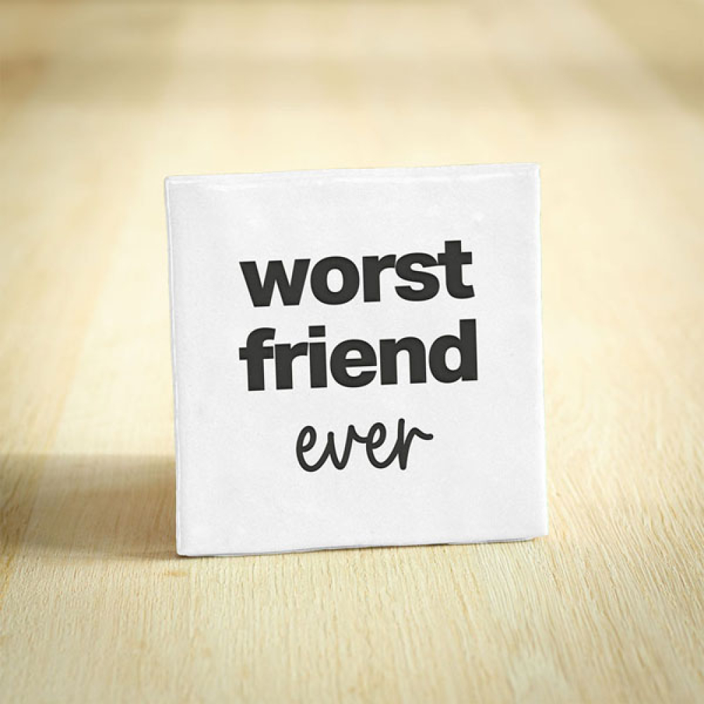 Tekst/Afbeelding: Worst friend ever Afmeting: 10x10cm Materiaal: Keramiek / vinyl Kleur tegel: Wit Kleur ontwerp: Zwart